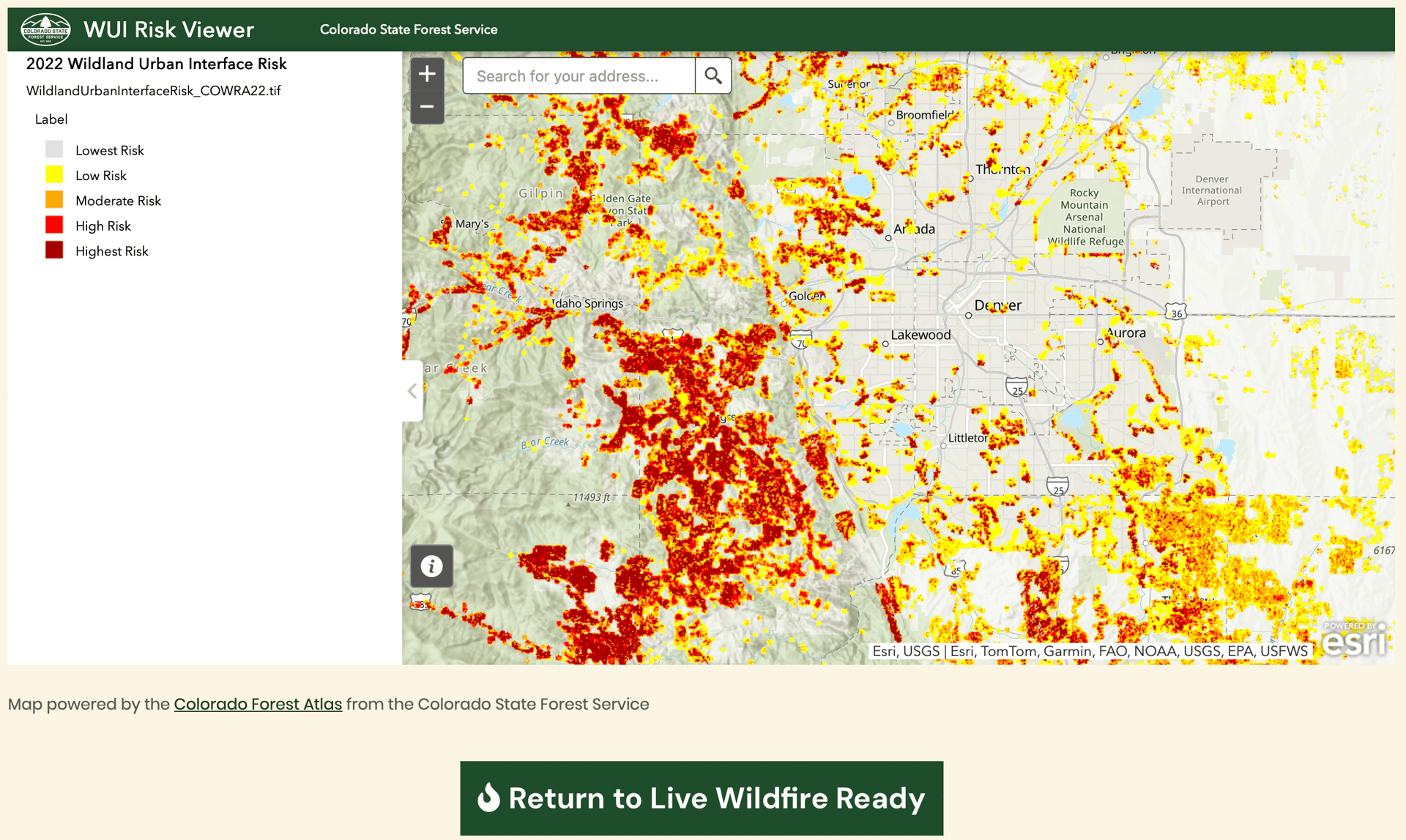 Open the CSFS Live Wildfire Ready WUI map. Search an address or zoom to a neighborhood, then read the legend to see how the tool classifies the surrounding area. The map is an educational first look at neighborhood-level risk, not a parcel by parcel rating, so plan on a site specific assessment later. Colorado State Forest Service